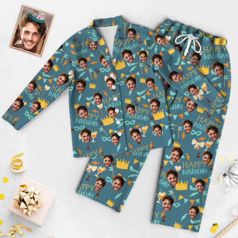 Custom Face Birthday Pajamas Personalized Photo Party Sleepwear Women Men Blue Pajama Set Happy Birthday
