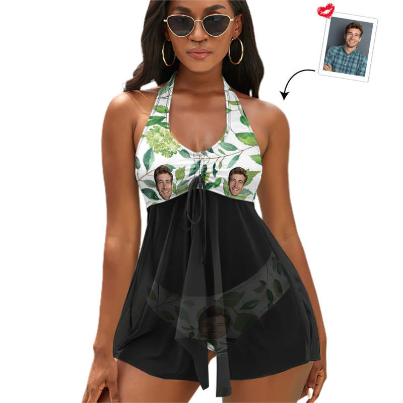 Custom Face Boyfriend Women's Strappy Neck Dress Swimsuit - Green Leaves Surfing Hawaiian Style