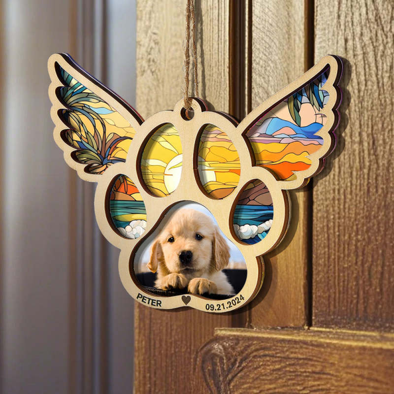 Celebrate the memory of your furry friend with our personalized pet suncatcher ornament. This special ornament features your pet's name and photo, making it a beautiful memorial gift for pet lovers. Each one is custom-made and captures the unique bond between you and your beloved pet.