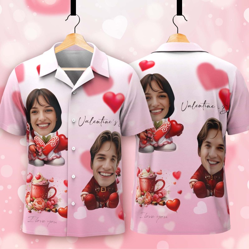Custom Face Hawaiian Shirt Pink Valentine Button-down Shirt Gift For Couple