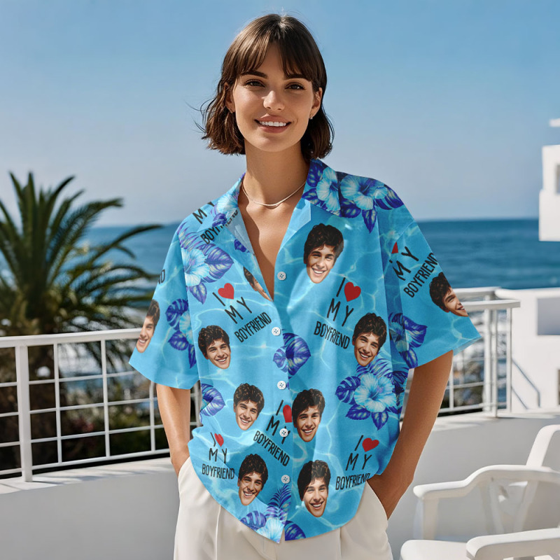 Startseite / Personalized Face Hawaiian Shirt Summer Vacation Couple Face Hawaiian Shirt I Love My Wife Blue Flower Hawaiian Shirt