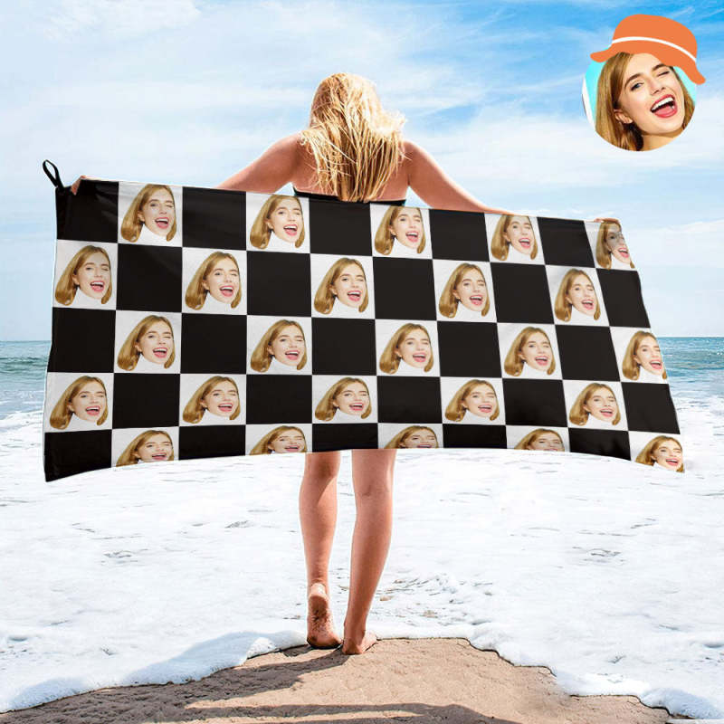Página de inicio / Toalla de playa personalizada con tablero de ajedrez de cara personalizada, toalla de playa con foto, regalo divertido