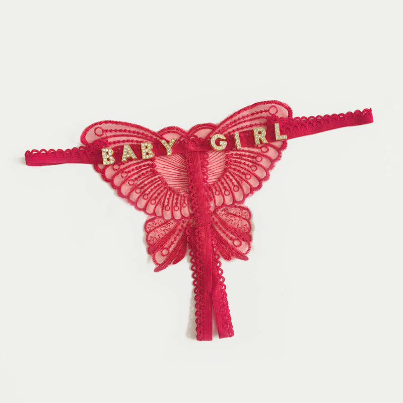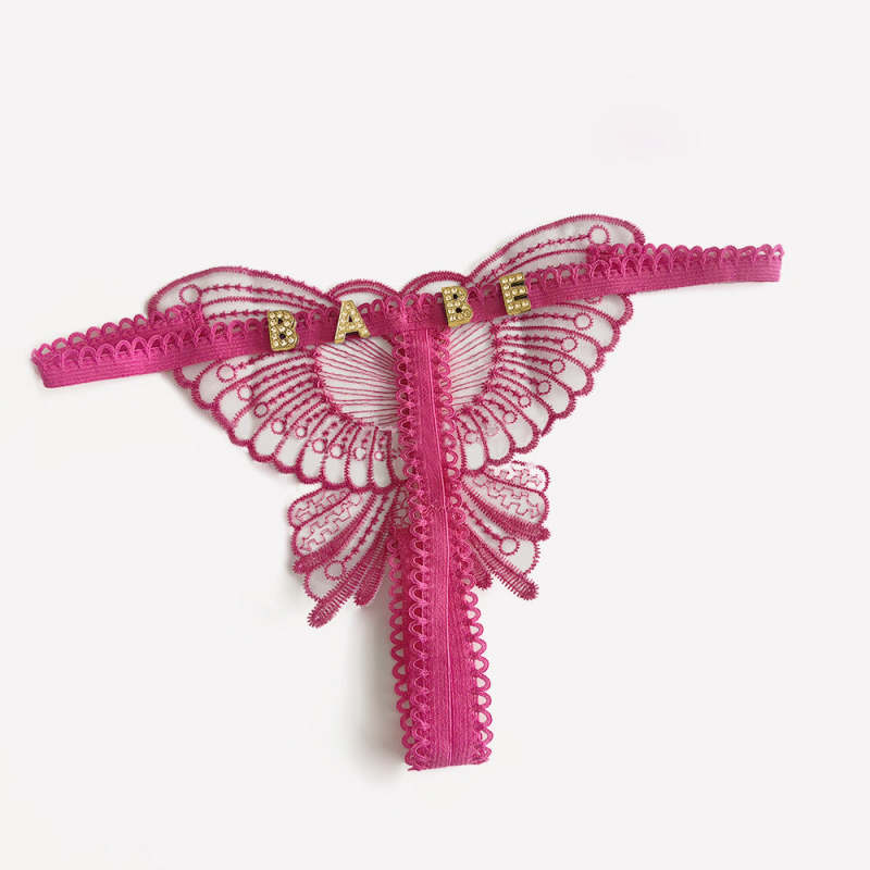 Página de inicio / Custom Lace Hollow Butterfly Sexy Low Waist Panty with jewelry Crystal Letter Name Open Cut Thong Underpants Women's Underwear