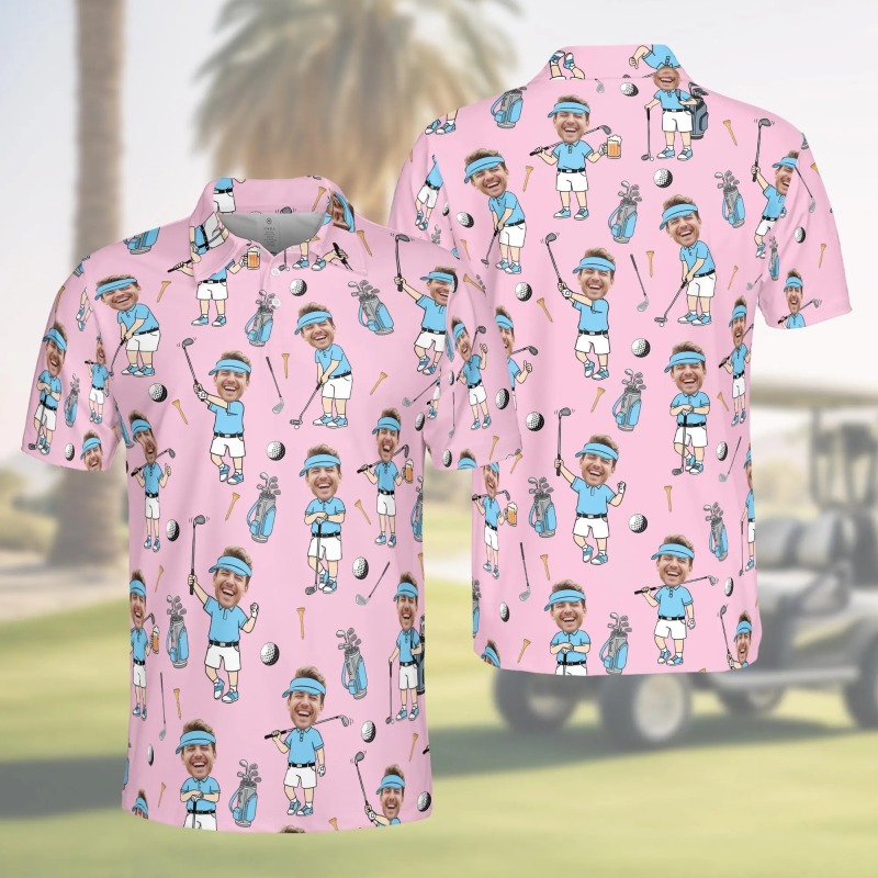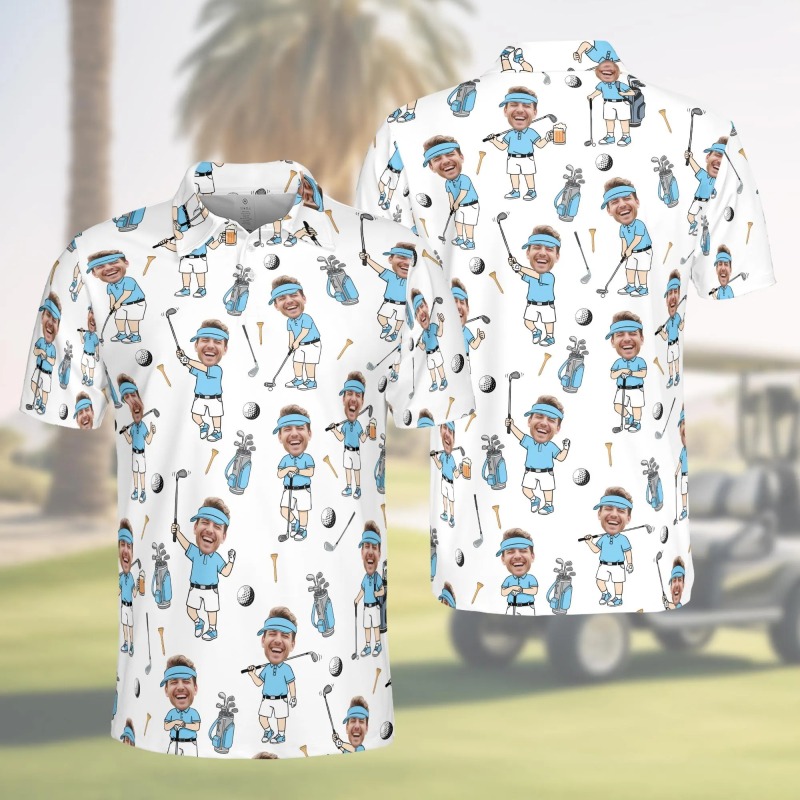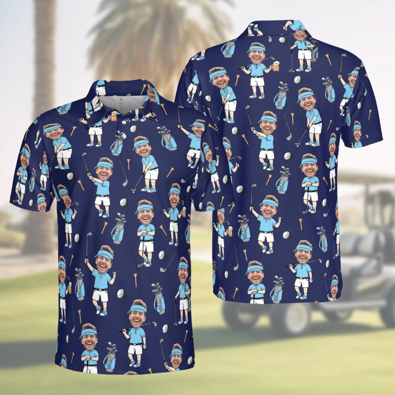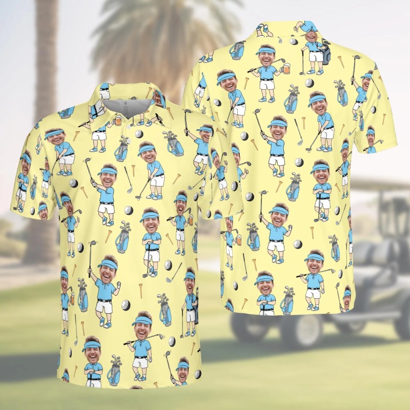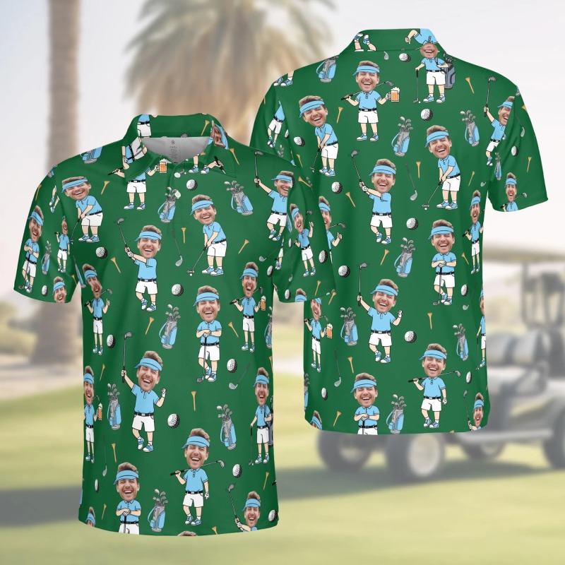 Custom Face Golf Polo Shirt for Men, Funny Cartoon Golfer Shirt, Matching Golf Team Polo, Summer Golf Shirt, Personalized Golf Lover Gift