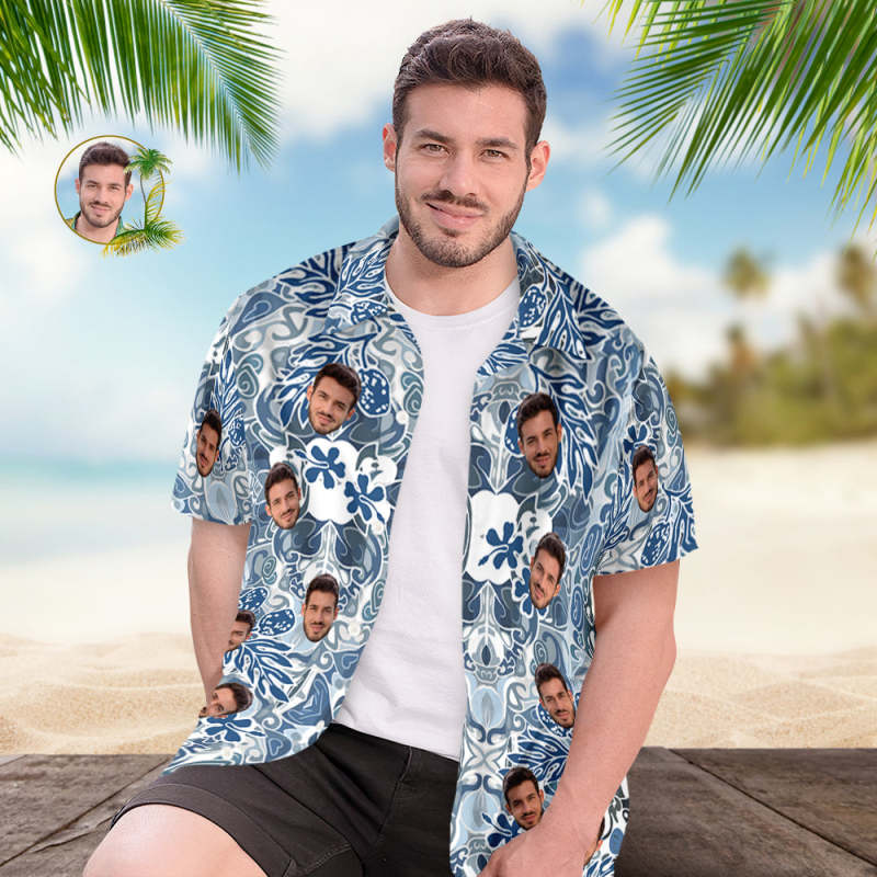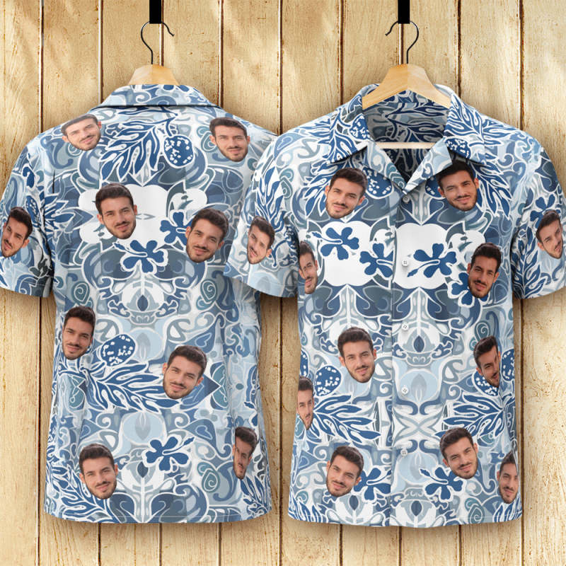 Custom Face Hawaiian Shirt Men's All Over Print Aloha Shirt Gift - Blue Vintage Pattern
