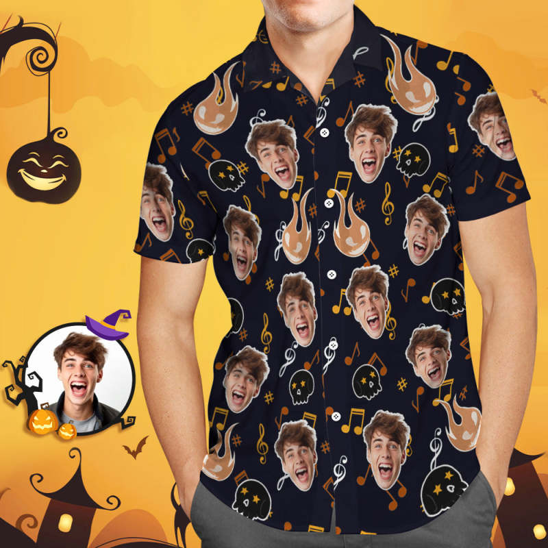 Custom Funny Face Hawaiian Shirt Halloween Photo Shirt Black Skull Halloween Drama Gift