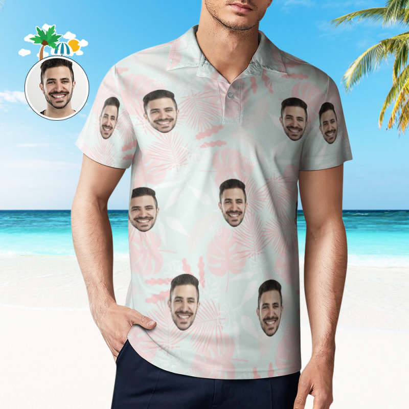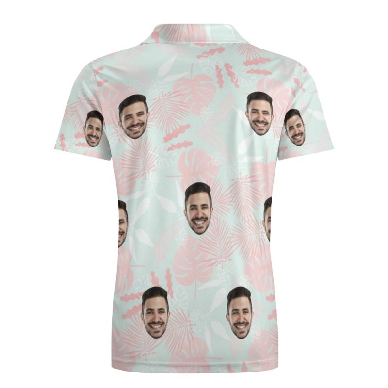 Men's Custom Face Polo Shirt Pink Leaves Personalized Hawaiian Golf Shirts