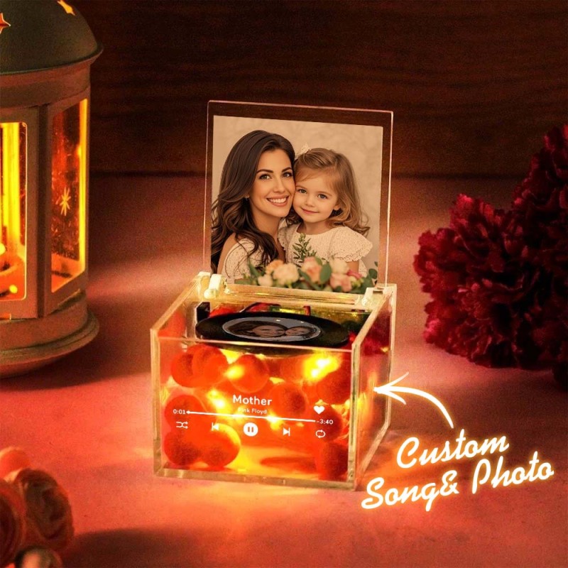 Bring a touch of nostalgia and personalization into your space with this Mini Music Record Player Custom Photo with Light Personalized Music Box. Designed to look like a vintage record player, this music box is more than just a decorative piece—it's a heartfelt keepsake that combines your cherished memories with soothing melodies.