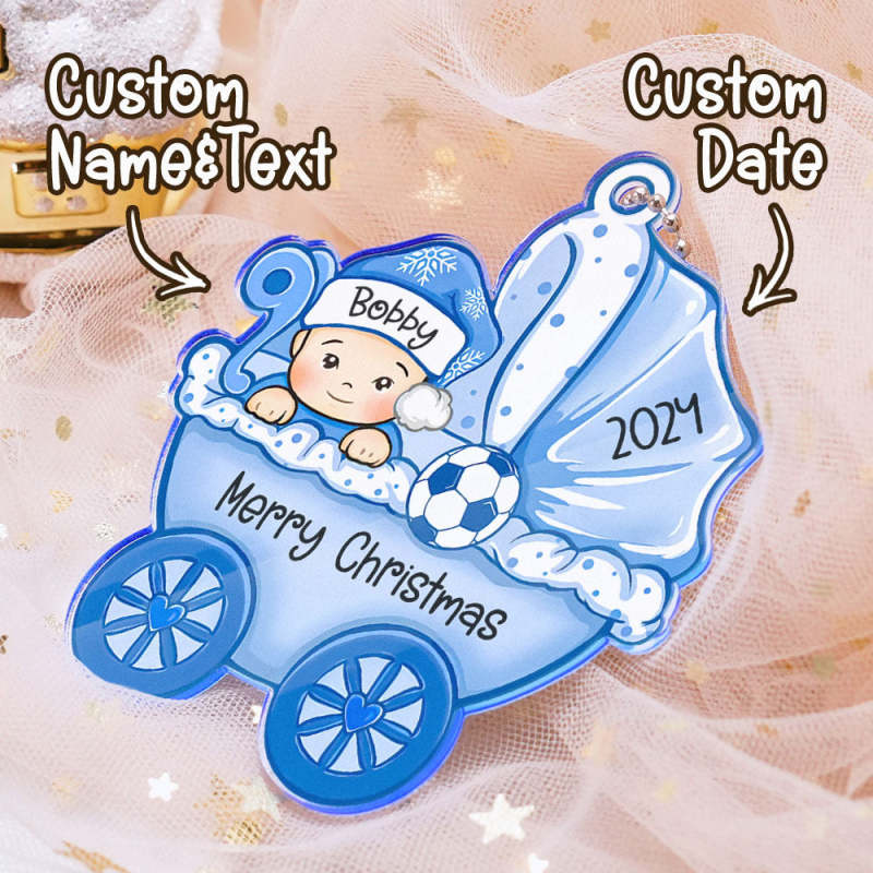 Celebrate your little one's first Christmas with a personalized baby carriage ornament. Made from acrylic materials and customized with your baby's name, this ornament is the perfect keepsake to remember this special milestone. Give the gift of memories this holiday season.