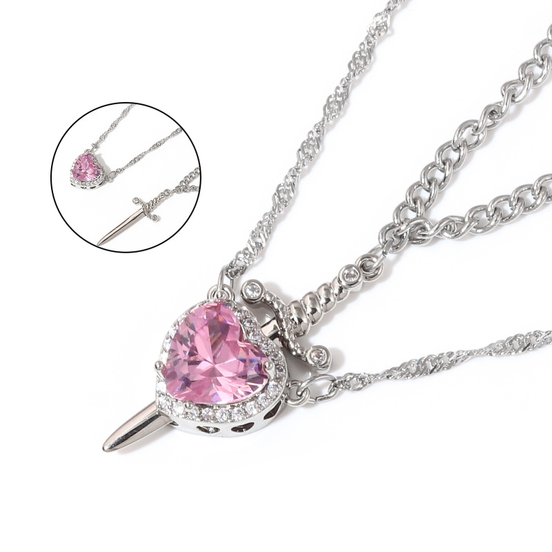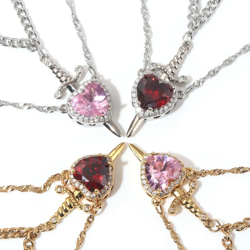 Declare your undying love with our captivating 'Love's Pierce' Magnetic Heart & Sword Couple Necklace Set. This exquisitely designed duo beautifully symbolizes the powerful bond between two souls, with one necklace featuring a stunning heart-shaped pendant (available in radiant red or delicate pink) embraced by sparkling cubic zirconia, and the other a sleek, matching sword.