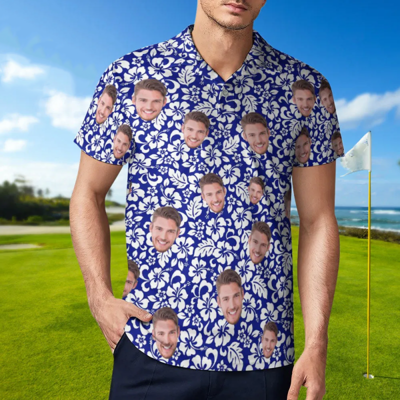 Custom Face Polo Shirt For Men Personalized Blue Hawaiian Golf Shirts