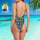 - Deep V neckline, low back and high leg.