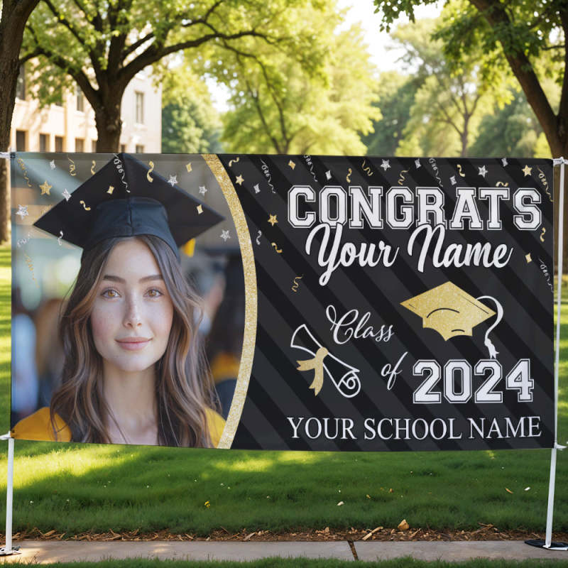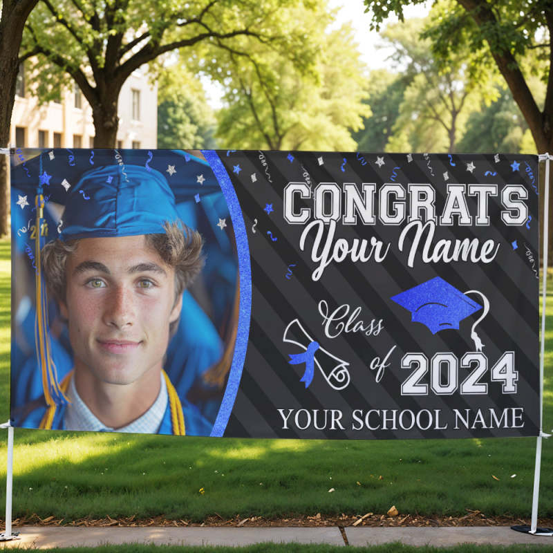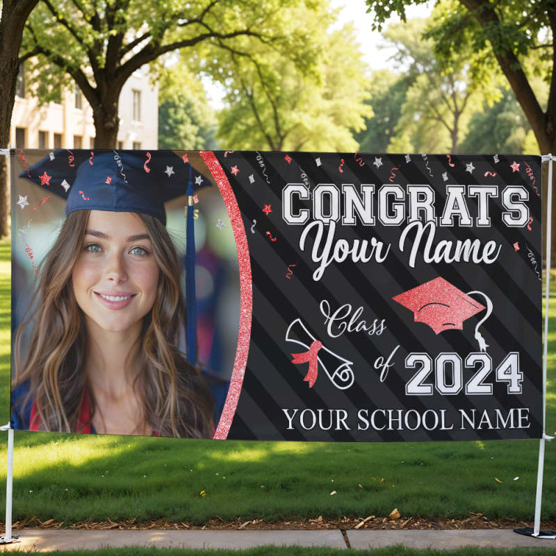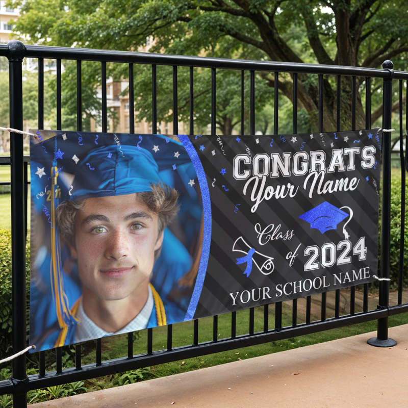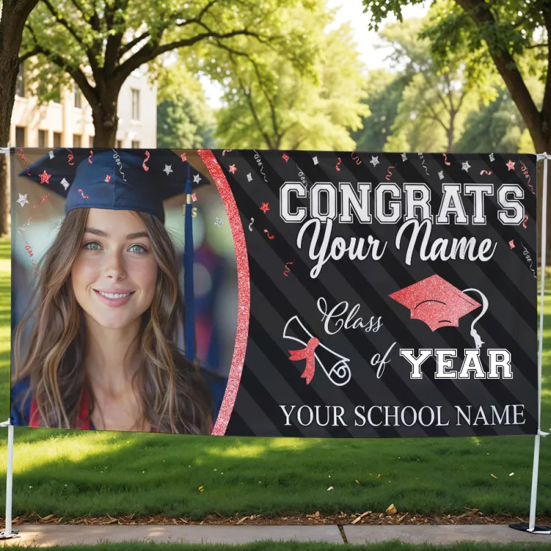 Our personalized custom banner is designed specifically for graduation. It is not only a one-of-a-kind outdoor decoration but also a surprise for your kids. Buy this awesome banner to share the good news with your friends!