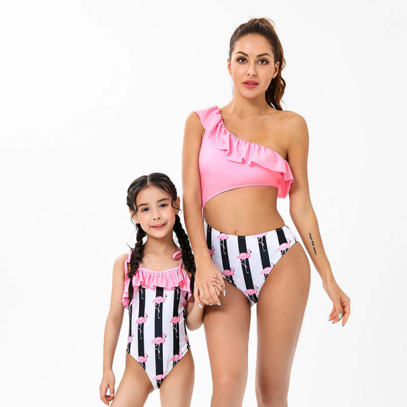 Flamingo Print Parent-Child Swimsuit Slanted Shoulder Ruffled One Piece Bikini