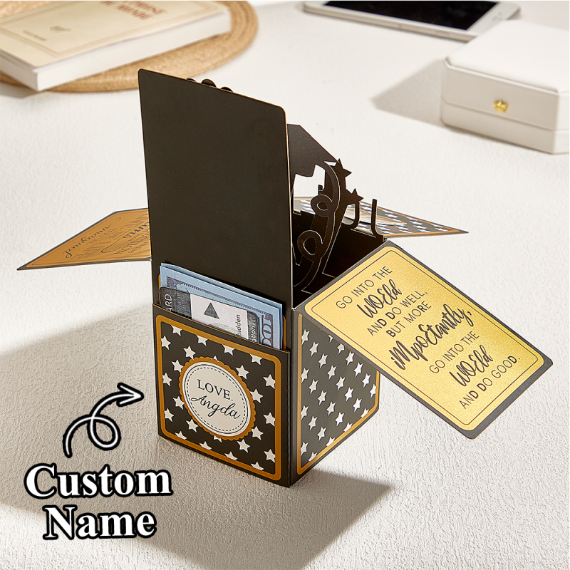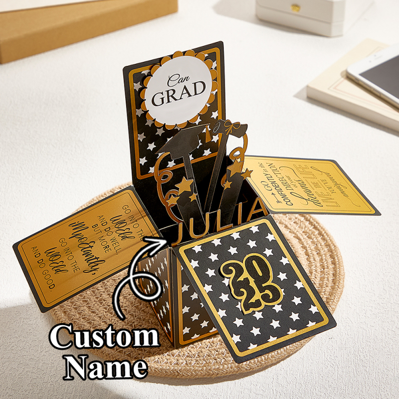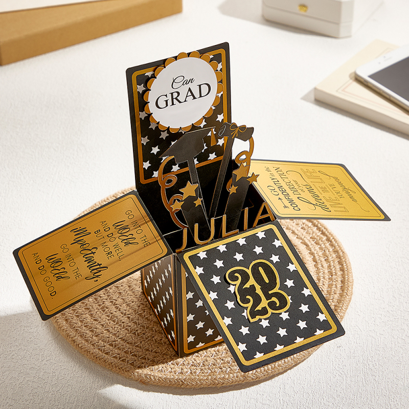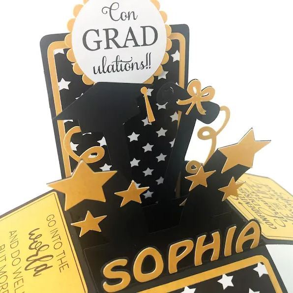 This box card folds flat and fits inside an envelope. It opens up into a 3D Card, with some beautiful quotes, a "conGRADulations!" (Congratulations grad) message, the graduating persons name, graduating year, a few stars, a cap and a scroll. As you can see, it's the perfect graduation gift for her or him! The graduating year will be the year on the date you place your order. (eg: if you place your order between January 1st 2025 and December 31st 2025, you'll receive a card with the year 2025 on it).