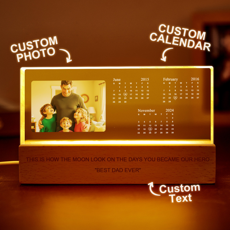 Celebrate unforgettable memories with this Custom Light-Up Calendar Lamp. Engraved with up to 3 custom calendar dates, a cherished photo, and your personalized message, this acrylic night light is a beautiful keepsake for Father’s Day, birthdays, or anniversaries. It’s a heartfelt gift that lights up any room—literally and emotionally.