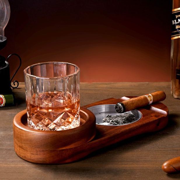 Cigar and whiskey aficionados can easily indulge in their passions in one go with this personalized whiskey ashtray! This innovative 2-in-1 wooden ashtray features a whiskey glass holder on one end and an ashtray on the other, and is completed with two rests for their rich cigars. The convenient coaster section can be elegantly engraved with the design of your choice, making it a memorable bar accessory.