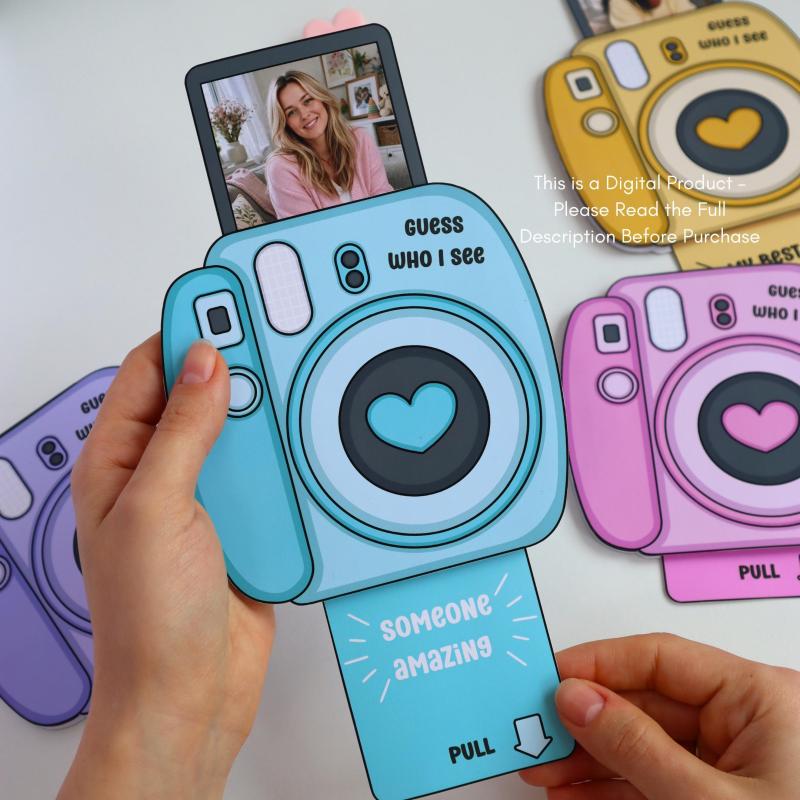 This printable card looks like a cute camera - just pull the tab and reveal a hidden photo inside. It’s a simple but magical way to surprise someone special!